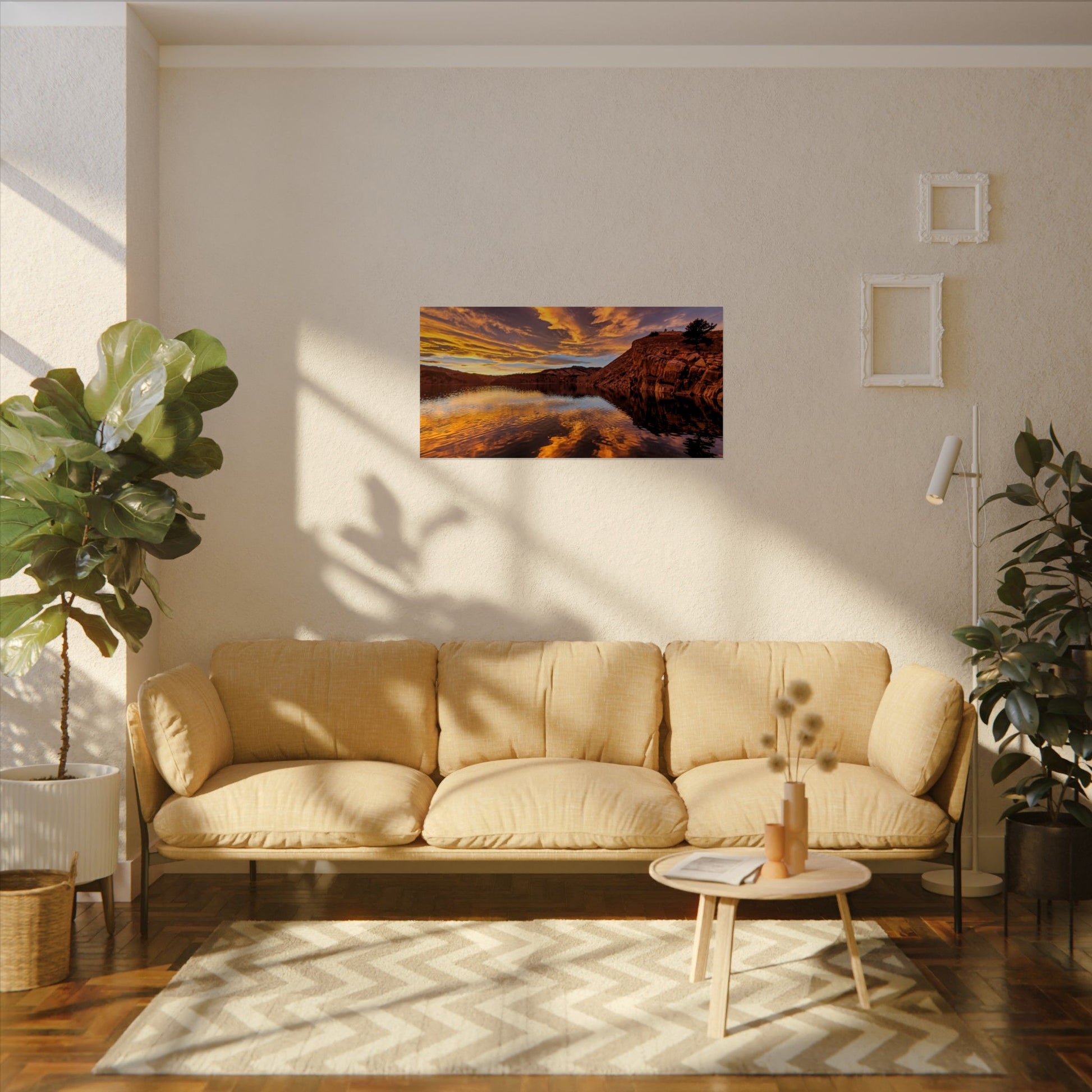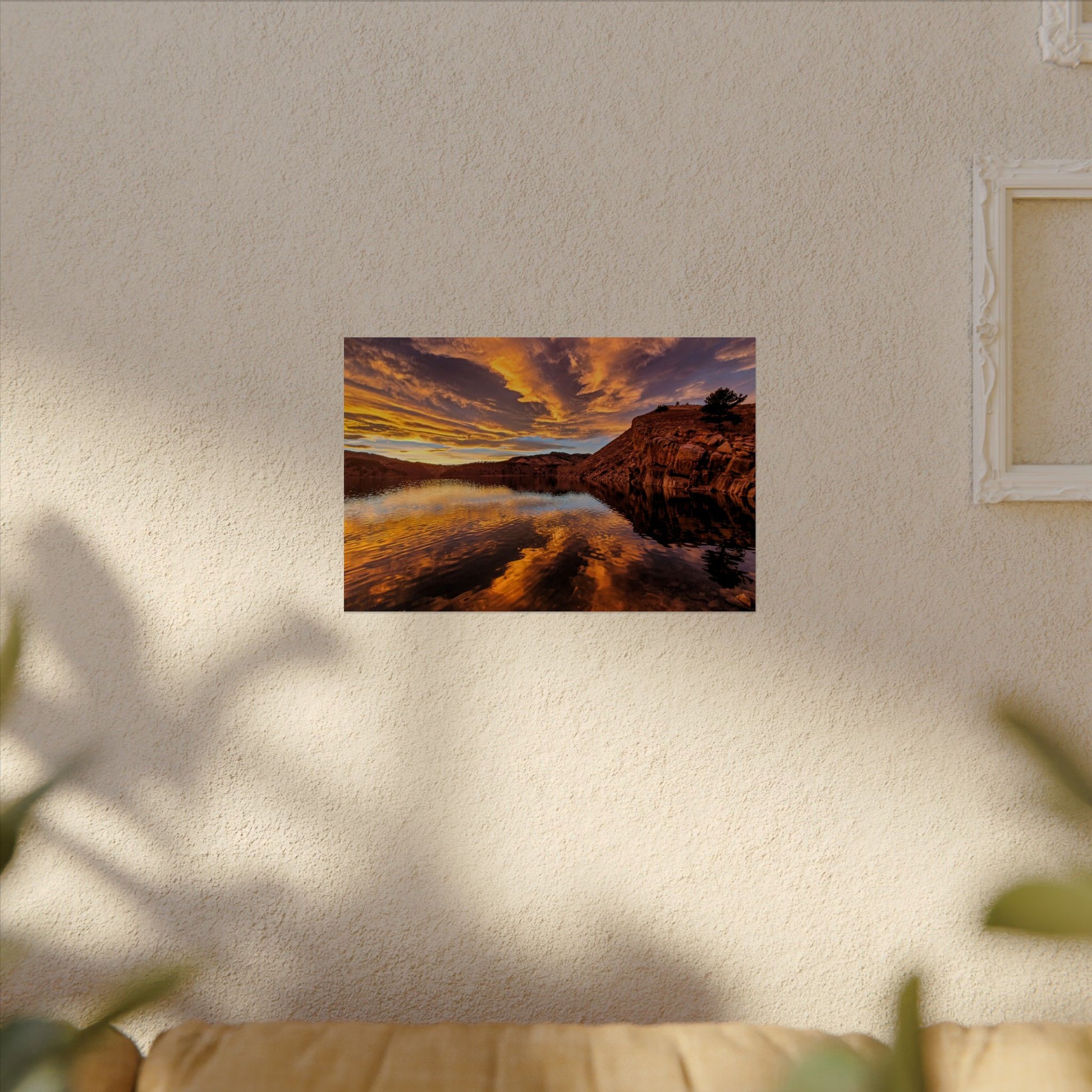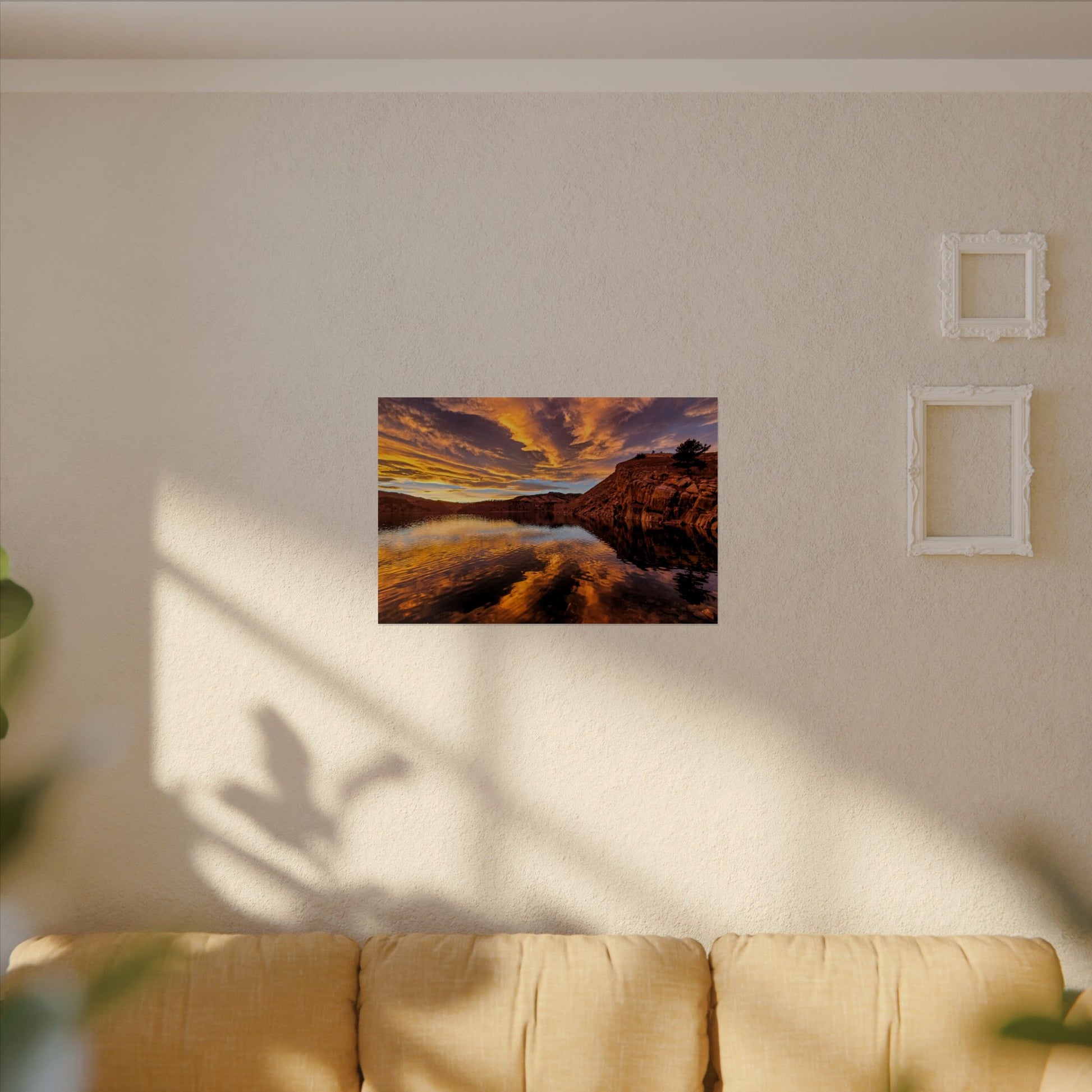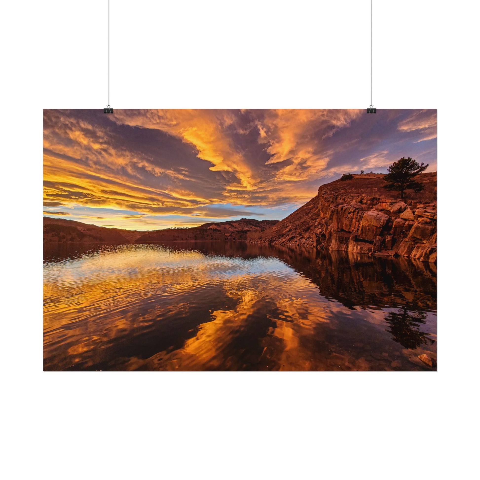 A vibrant featuring a colorful sunset reflection at Horsetooth Reservoir in Fort Collins, Colorado. This stunning piece of wall art gives off a serene and natural vibe, perfect for nature lovers and those who appreciate beautiful landscapes. It's a great addition to any home decor, especially for those who enjoy outdoor scenery and peaceful settings. Ideal for gifting on birthdays, housewarmings, or as a unique piece of art for any special occasion.