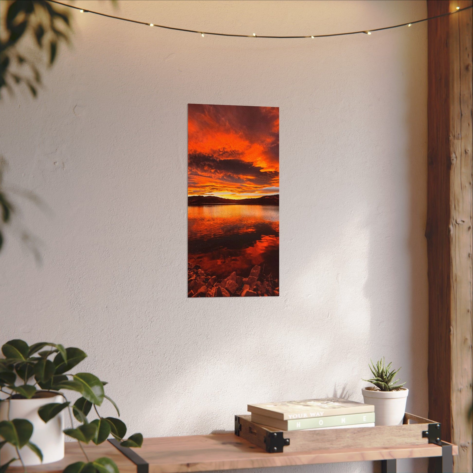 Capture the vibrant colors of a sunset at Horsetooth Reservoir in Fort Collins, Colorado with this tall orientation textured watercolor poster. Perfect for nature lovers and those who appreciate stunning landscapes. Ideal for decorating a living room, bedroom, or office space. Relevant for home decor, nature-themed rooms, and gifts for outdoor enthusiasts.