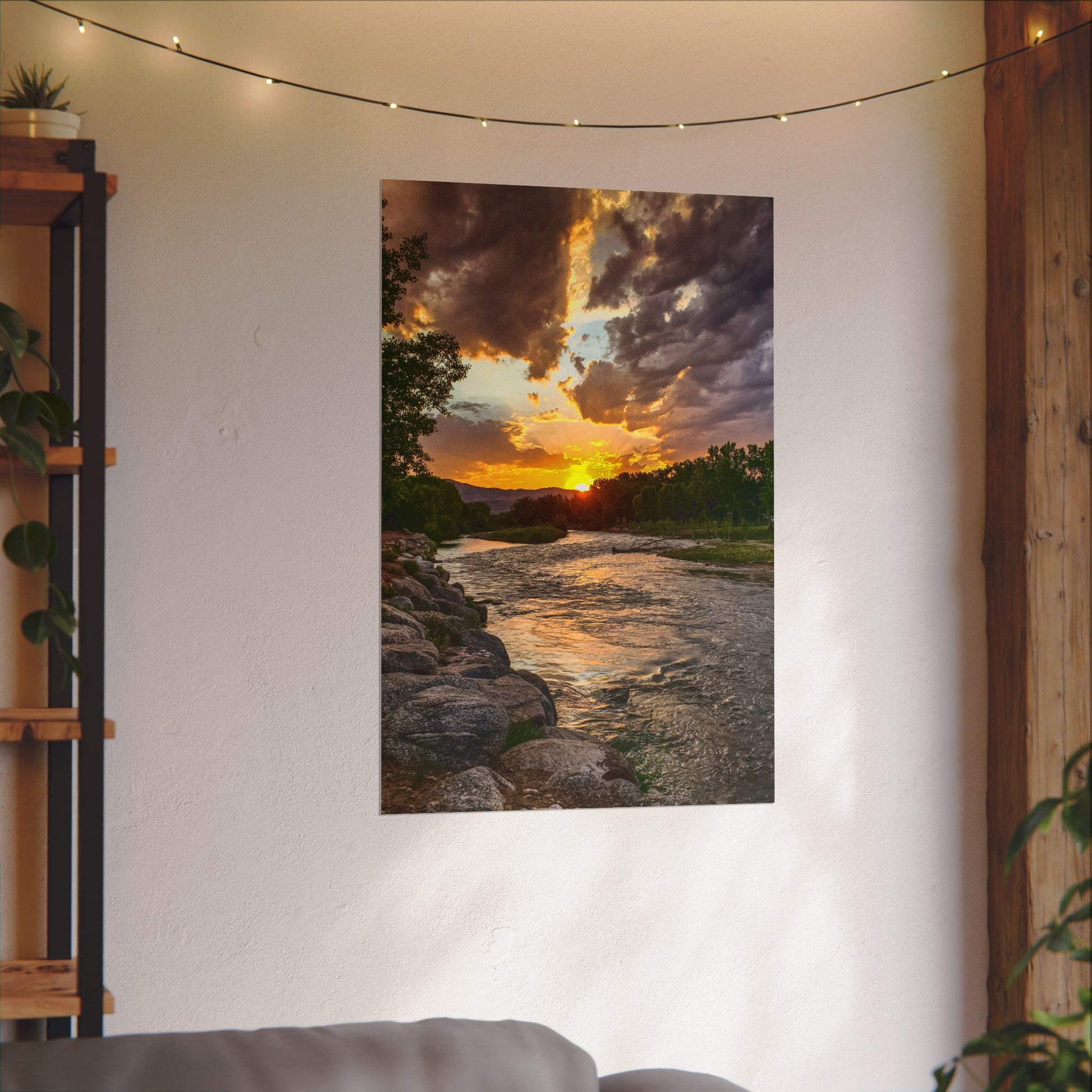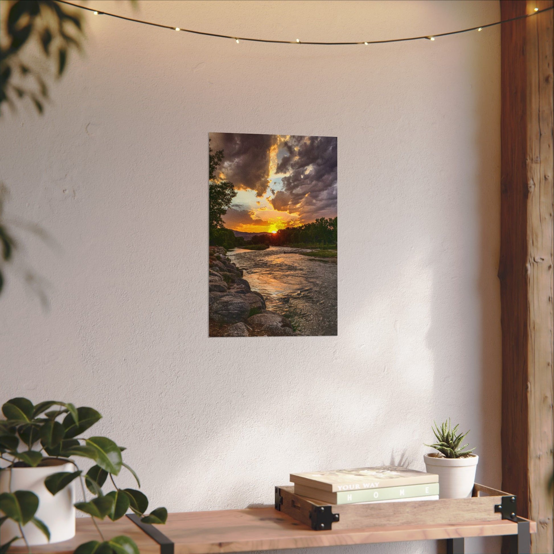 Experience the vibrant colors of a textured watercolor matte poster featuring a stunning sunset scene along the Arkansas River in Canon City, Colorado. Perfect for art enthusiasts looking to add a touch of nature's beauty to their walls. Ideal for home decor, gifts for nature lovers, and as a unique piece for cozy spaces. Relevant for home decor, gifts for artists, nature enthusiasts, and travel memories.