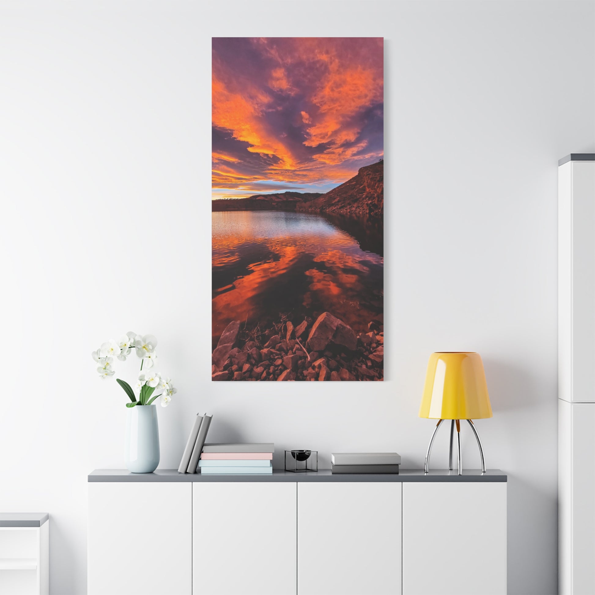 Capture the vibrancy of a colorful sunset reflection at Horsetooth Reservoir in Fort Collins, Colorado, with this tall orientation matte canvas print. Perfect for nature lovers and those who appreciate stunning landscapes. Ideal for decorating a living room, bedroom, or office space. Relevant for home decor, nature-themed rooms, and gifts for outdoor enthusiasts.